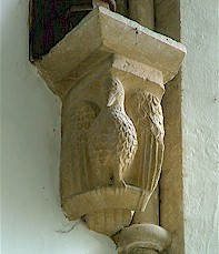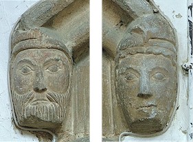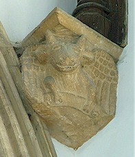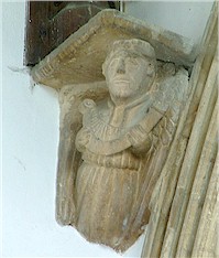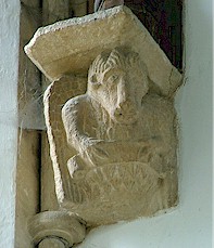 The foliage has been subsequently chipped away, perhaps in an attempt to disguise his pagan purpose. Both figures appear to be in a later architectural style than the 1220 date of the the building.
