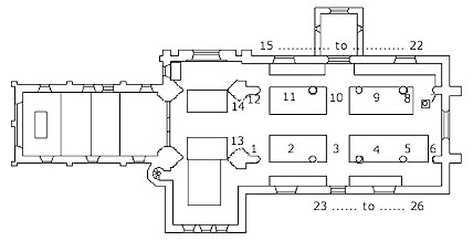 | Arch Ends - Number 19 is a replacement and is the carved figure of the head of Victor Farrer the church architect during the restoration of the clerestory windows. Fifteen is of interest, its function could be to frighten off evil spirits or, in medieval iconography, it could have a phallic meaning. Seventeen and twenty-one are grotesque figures. |