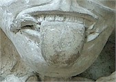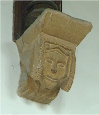 Warding off evil spirits may have been the purpose of the carved stone figure (13) on the springer of the nave arch opposite the pulpit. He eternally pokes his tongue out at the woman opposite (14), in the certain knowledge that she is powerless to respond, however this may be a cover for his true identity – a Green Man.