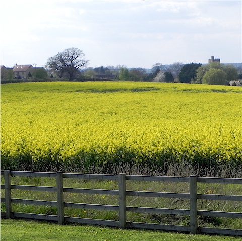 Left photograph: A rape field near Felmersham, April 2014.