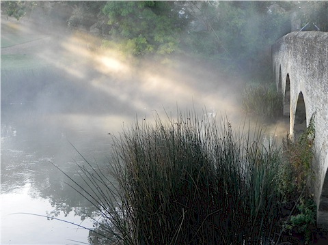 A shaft of sunlight pierces the autumn mist at Felmersham bridge. |